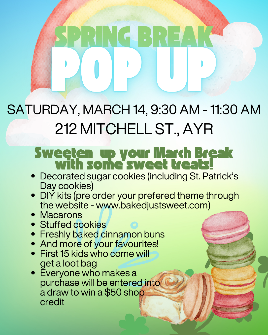 Pop up will be at the Garage Door Cookie Co, 212 Mitchell St., Ayr on Saturday, March 14 from 9:30 - 11:30 am. Unfortunately I am unable to accommodate an early pick up. If you need an alternate pick up time, please message me and we can coordinate another pick up time.